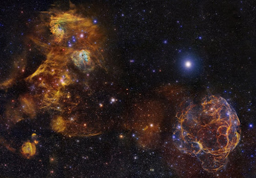 No canto superior esquerdo, parecendo uma foice, está a Nebulosa da Estrela Flamejante, também denominada IC 405. Logo à abaixo está a Nebulosa do Girino, também denominada IC 410. No canto inferior esquerdo está o Sharpless 232. No canto inferior direito está o grande remanescente de supernova Simeis 147, também conhecida como Nebulosa do Espaguete.